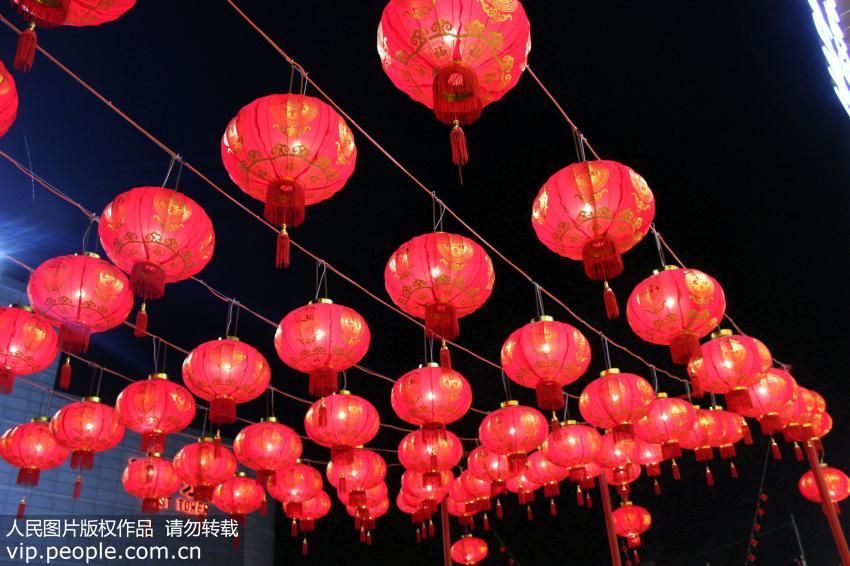 2月7日晚拍摄的大红灯笼装饰下的苏州街头。(王建康/人民图片)