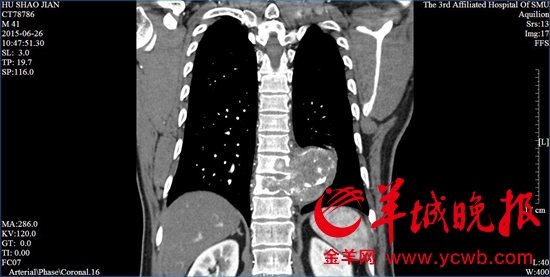 一位患者的脊柱已被肿瘤包围。(图片来源:金羊网)