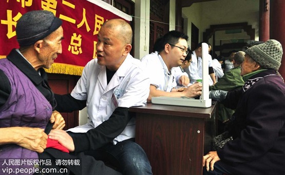 在四川江油市三合敬老院,市第二人民医院胃肠外科主任何元正在给81岁老人魏育全检查胃肠疾病。(成和平/人民图片)